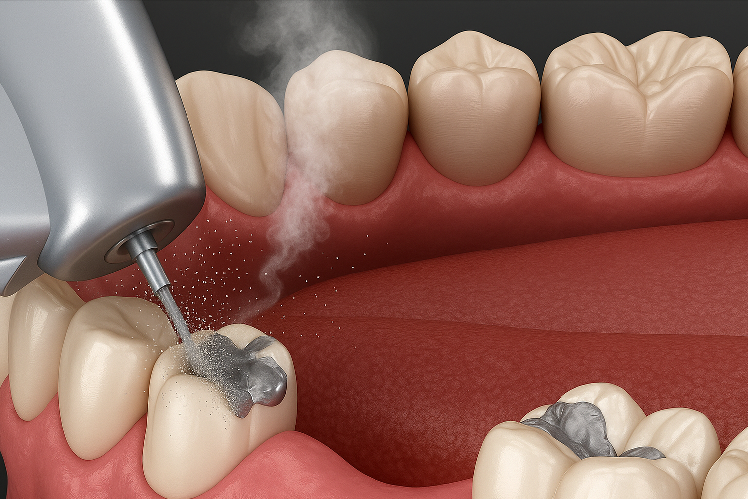 Beim Bearbeiten von Amalgamfüllungen treten Spitzenwerte von bis zu 1.400 µg/m³ auf – das liegt weit über dem zulässigen Arbeitsplatzgrenzwert von 100 µg/m³.